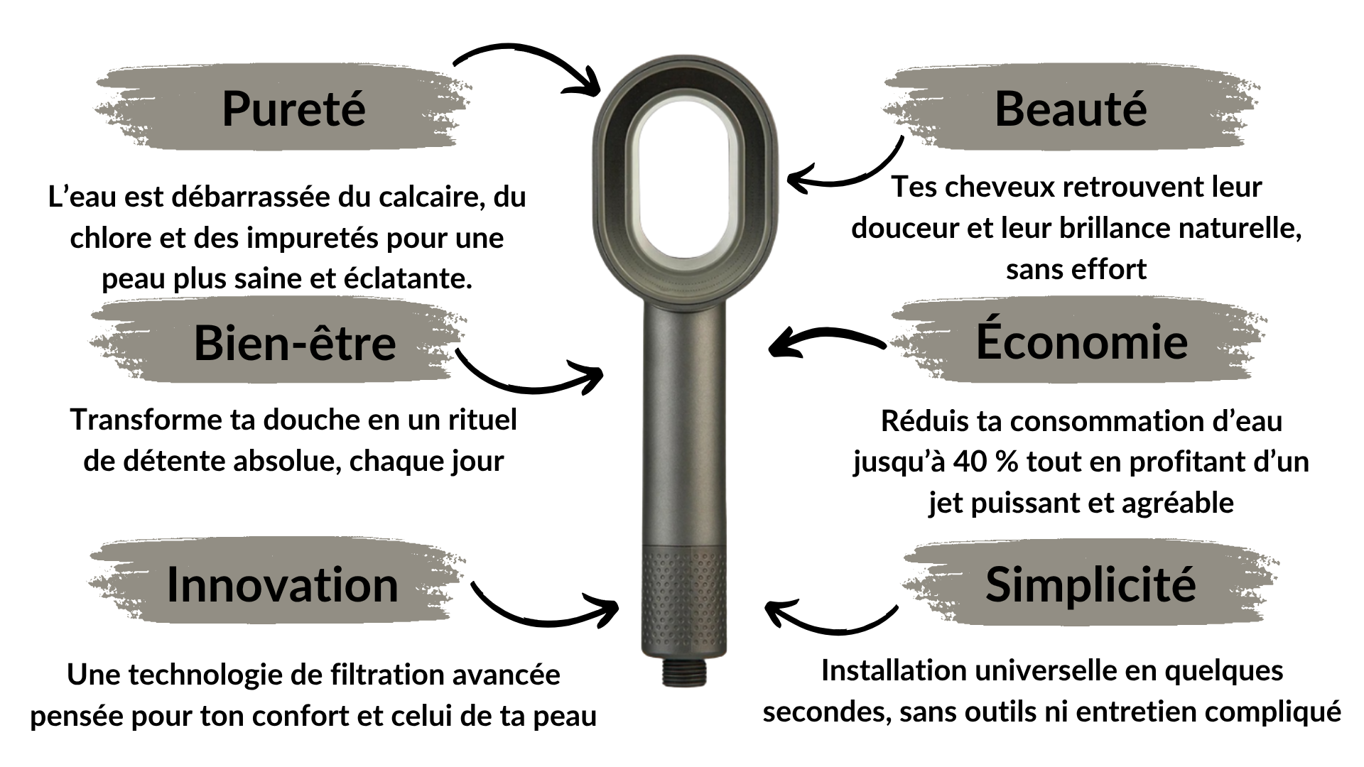 Le filtre élimine le chlore, le calcaire et les métaux lourds responsables des irritations cutanées et des cheveux ternes.